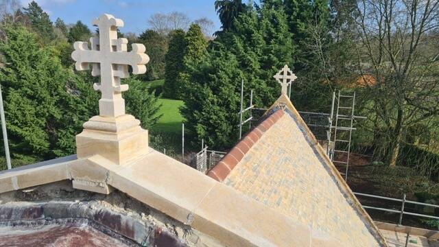 These are now on site ready to be placed on the north east gable. A cross and apex stone will be added later.They aim to start laying the new slates as soon as they can.