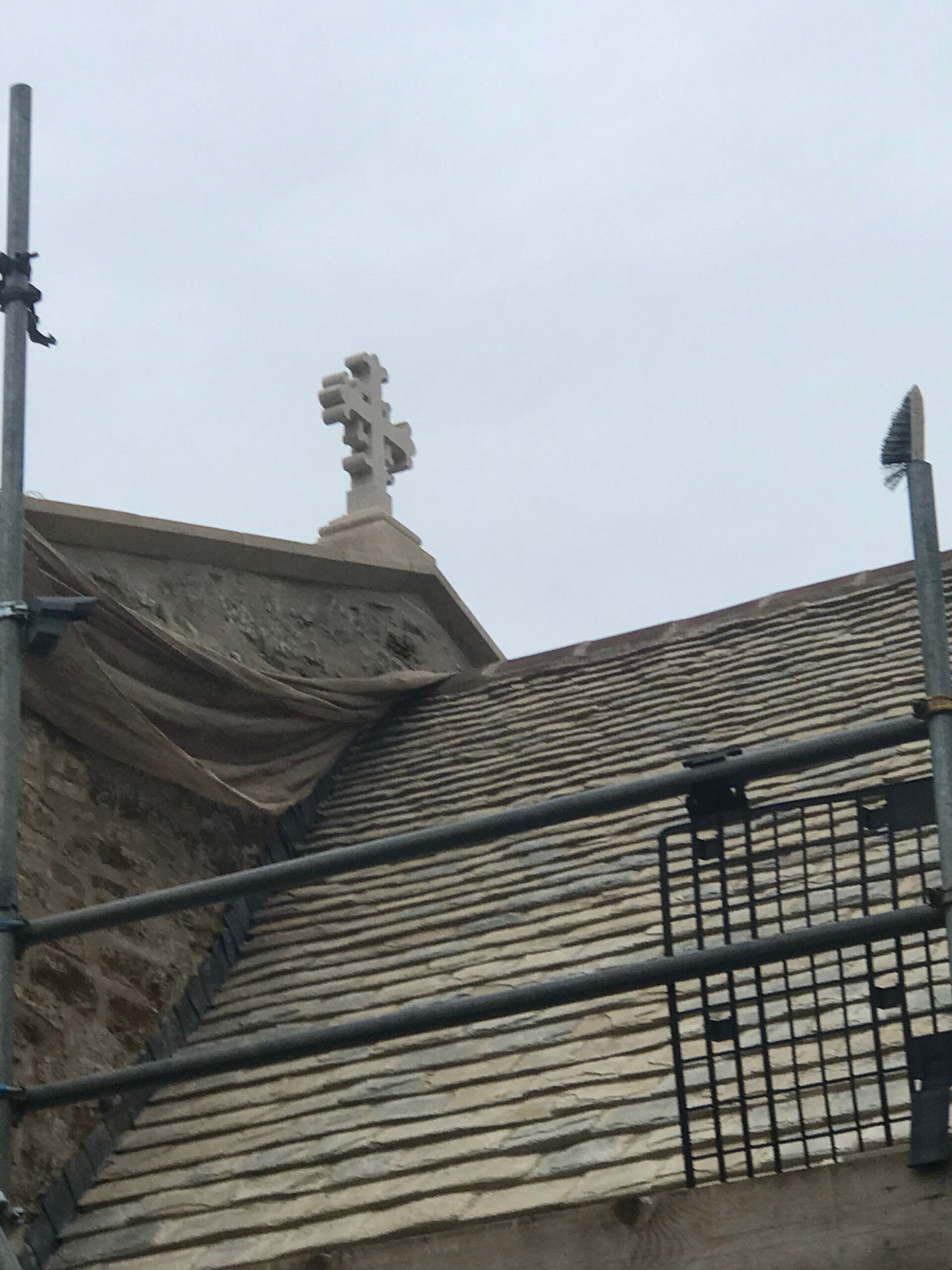 The 3 new roof crosses are in place and the re roofing of the porch has been completed